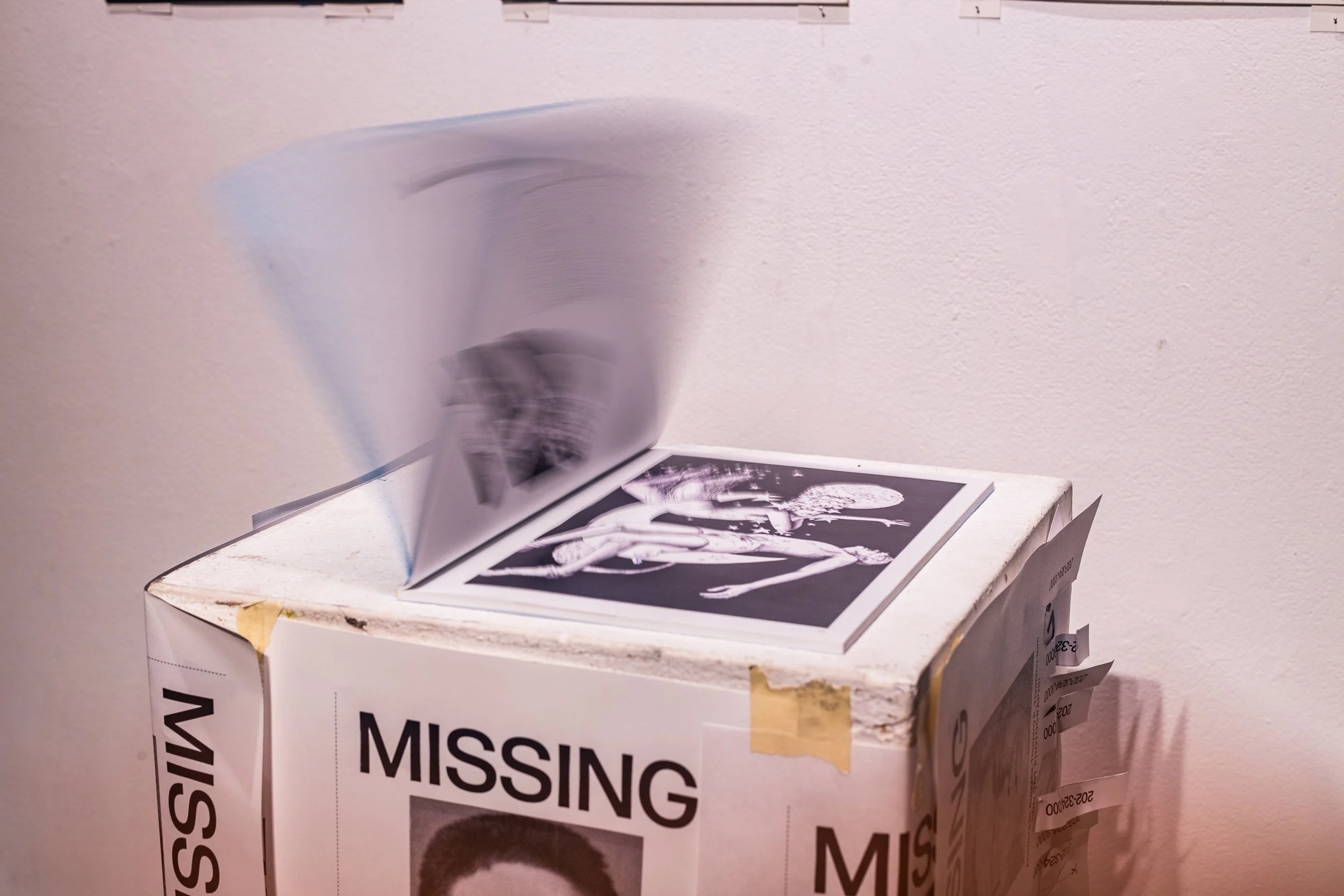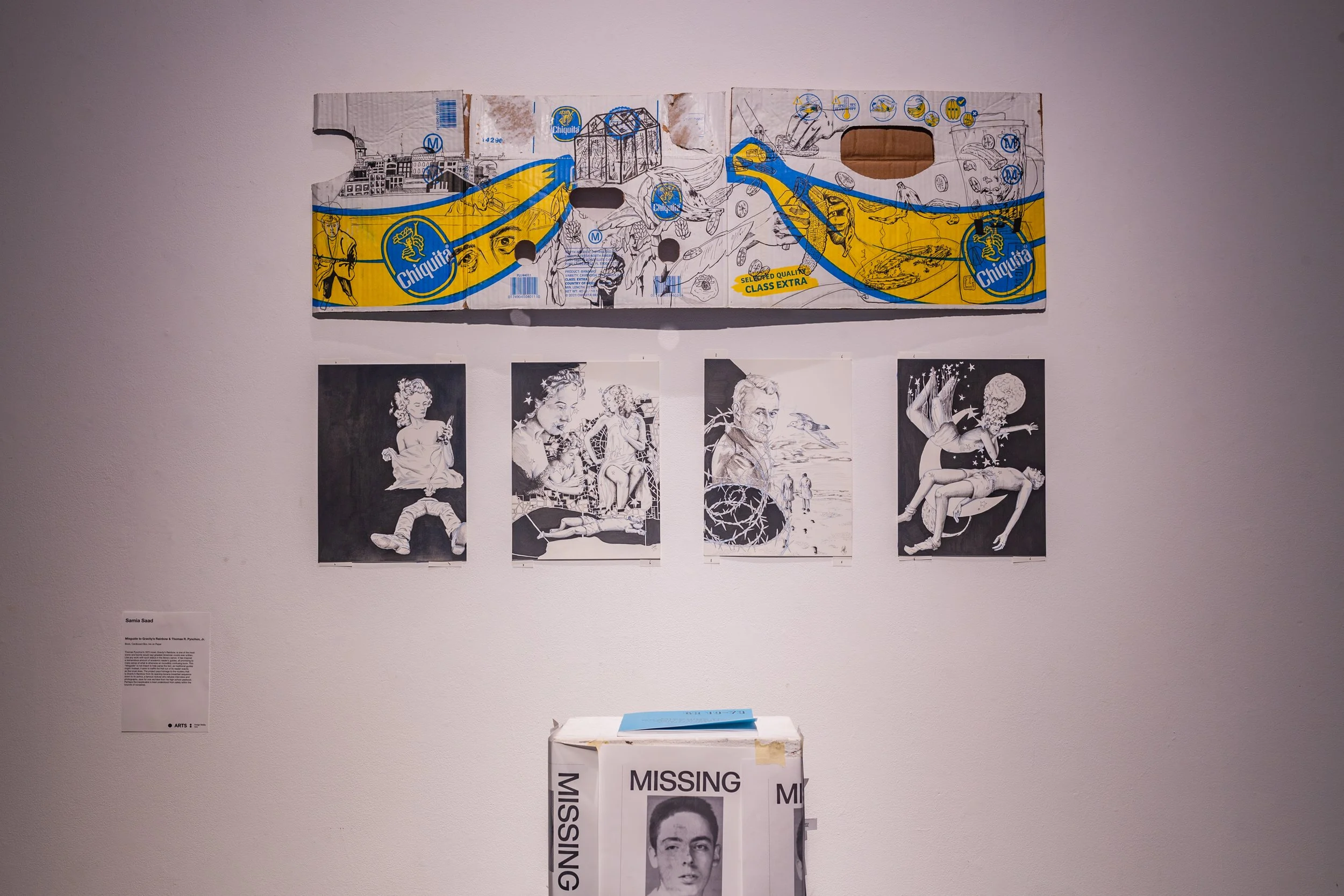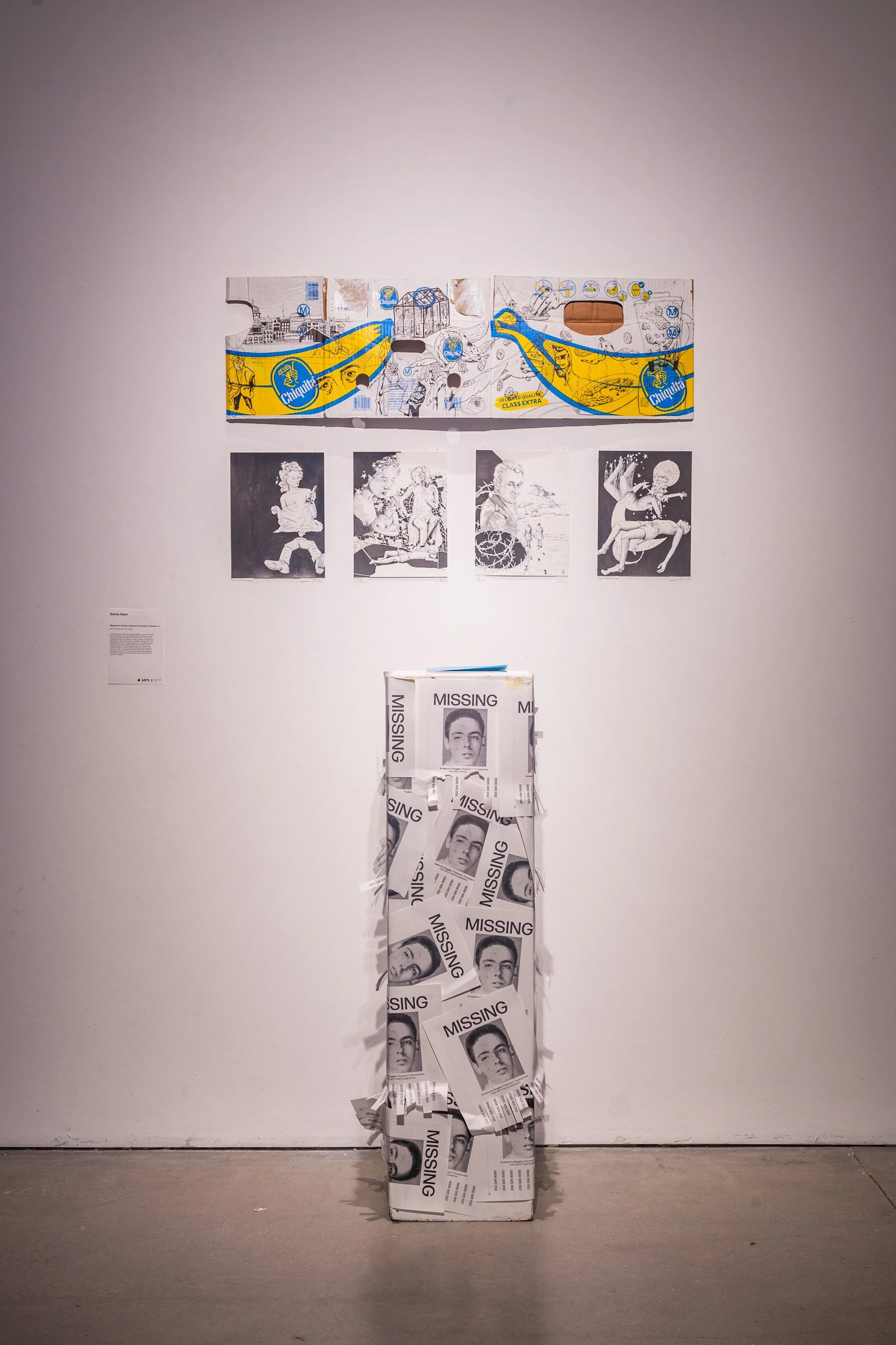 The Misguide was accepted into the 2024 UCLA DMA Undergraduate exhibition in the New Wight Gallery. The book sits atop a pedestal adorned with MISSING flyers calling for information on the mysterious, reclusive Pynchon's whereabouts. Four drawings I made for the book appear on the wall, along with a flattened banana box on which I drew the iconic opening sequence of the novel, where the preparation of a banana breakfast is described in great detail.